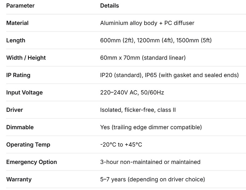 Medžiaga: Paprastai ekstruzinis aliuminis šilumai išsklaidyti, suporuotas su polikarbonato difuzoriumi. Yra plieninių versijų, tačiau aliuminis yra auksinis standartas, skirtas šviesos diodams vėsinti.