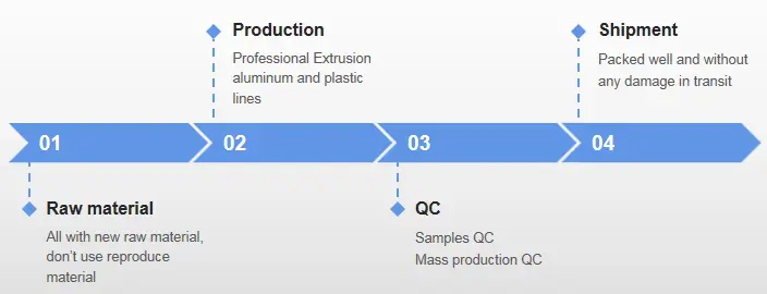 Kaip profesionalus LED aliuminio profilio ir LED plastikinių profilių gamintojas, JE visada sutelkia dėmesį į gaminių kvalifikaciją nuo aliuminio ir plastiko žaliavos iki ekstruzijos gamybos linijos, nuo mėginių kokybės kontrolės iki masinės gamybos kontrolės, nuo tvirtos tobulos pakuotės iki visapusiško aptarnavimo.